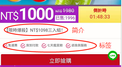 簡介:用來seo搜索有用,或者推廣有用,在前臺(tái)商品詳情里回顯示出來。 例:【限時(shí)爆殺】NT$1098三入組!