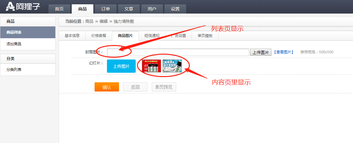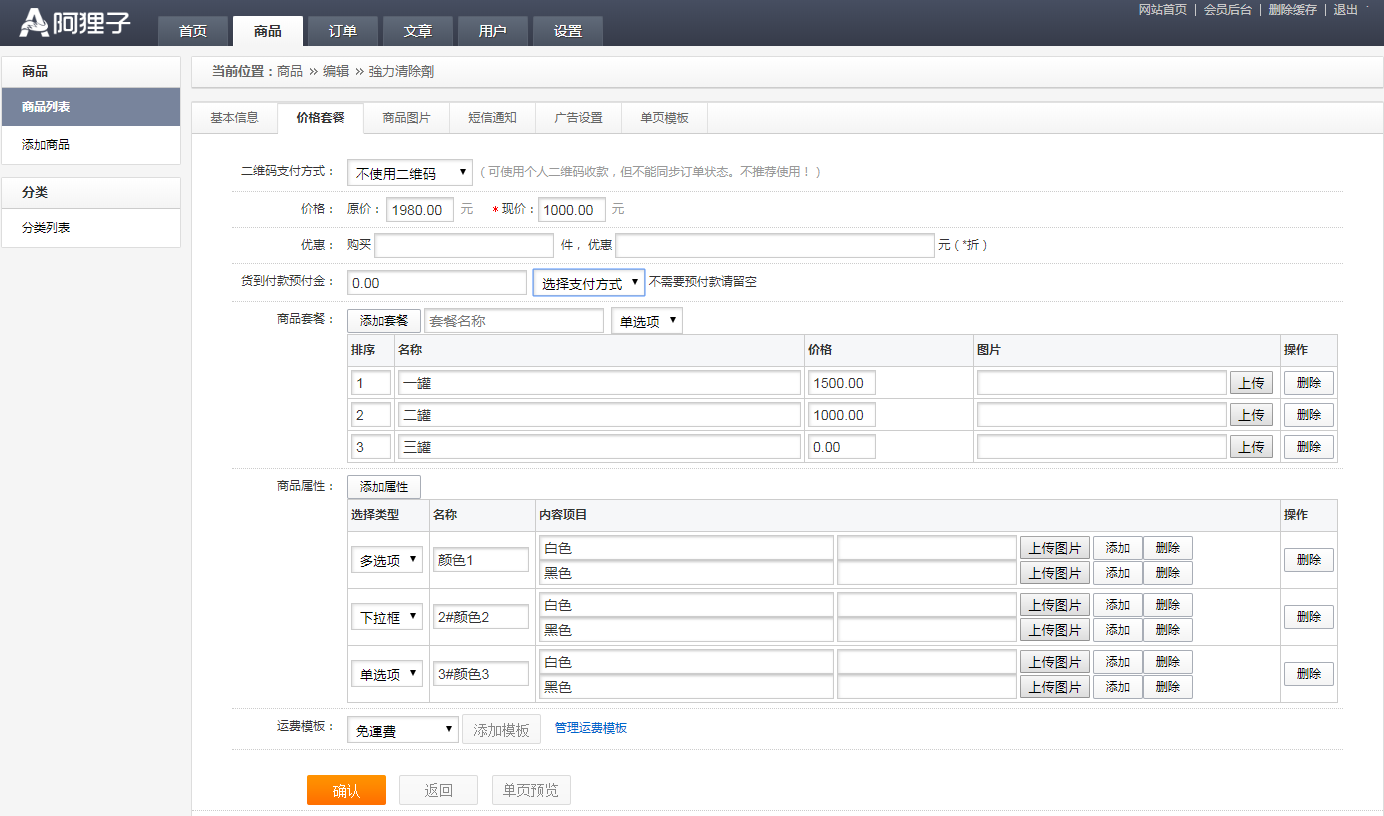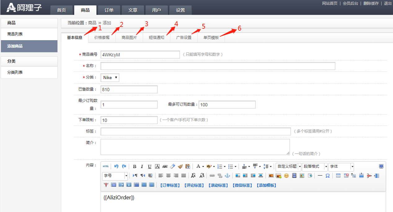 添加商品有:1.基本信息;2.價(jià)格套餐;3.商品圖片;4.短信通知;5.廣告設(shè)置;6.單頁模板;如下圖: