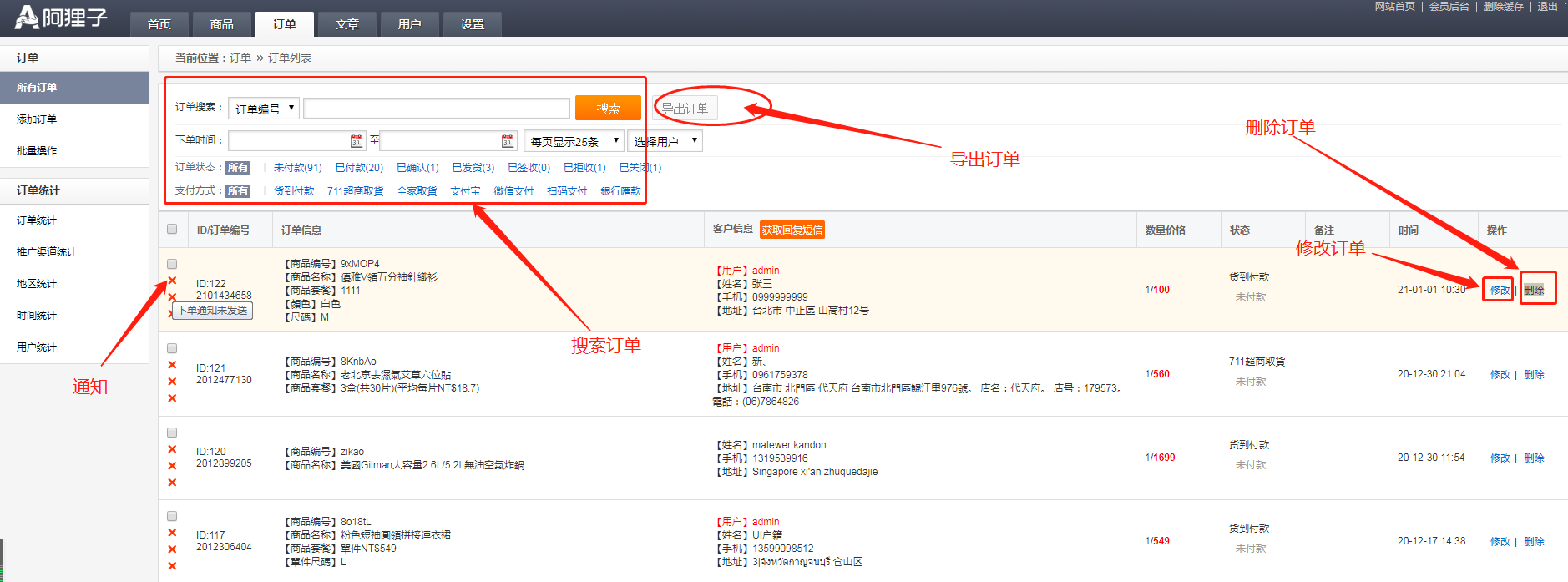 進(jìn)入訂單列表,點(diǎn)擊訂單右側(cè)的修改進(jìn)入,可以修改訂單信息及訂單狀態(tài),如進(jìn)行確認(rèn),發(fā)貨等狀態(tài)操作