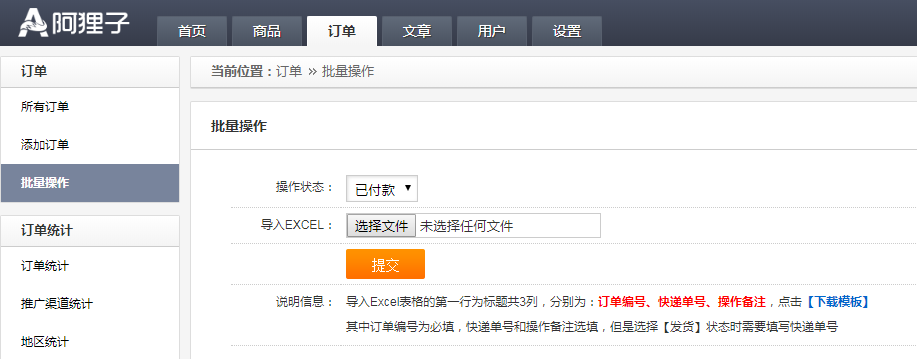 導(dǎo)入Excel表格的第一行為標(biāo)題共3列,分別為:訂單編號(hào)、快遞單號(hào)、操作備注,其中訂單編號(hào)為必填,快遞單號(hào)和操作備注選填,但是選擇【發(fā)貨】狀態(tài)時(shí)需要填寫快遞單號(hào)
