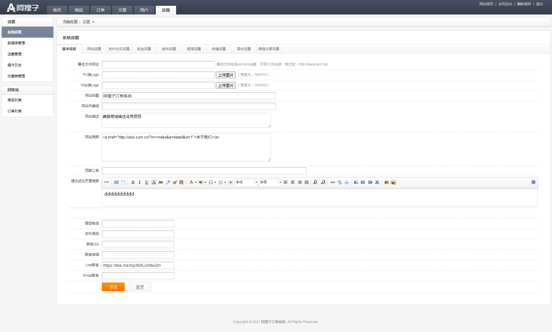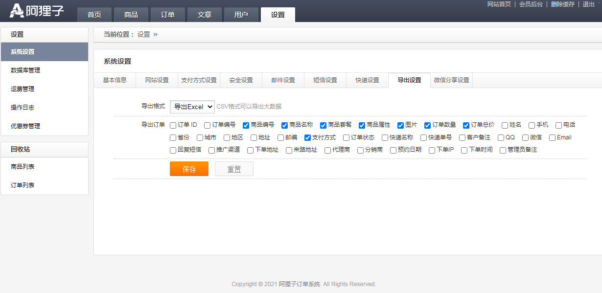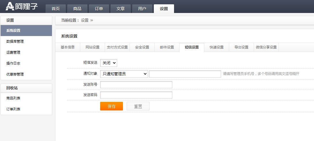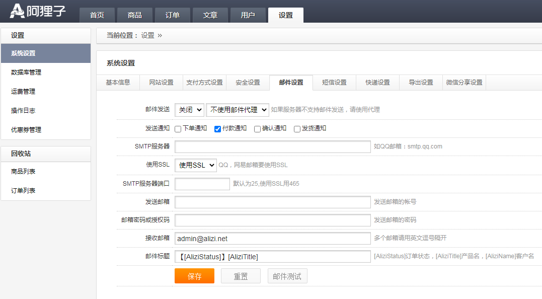 1.基本信息;2.網(wǎng)站設(shè)置;3.支付方式設(shè)置;4.安全設(shè)置;5.郵件設(shè)置;6.短信設(shè)置;7.快遞設(shè)置;8.導(dǎo)出設(shè)置;9.微信分享設(shè)置。 如下圖