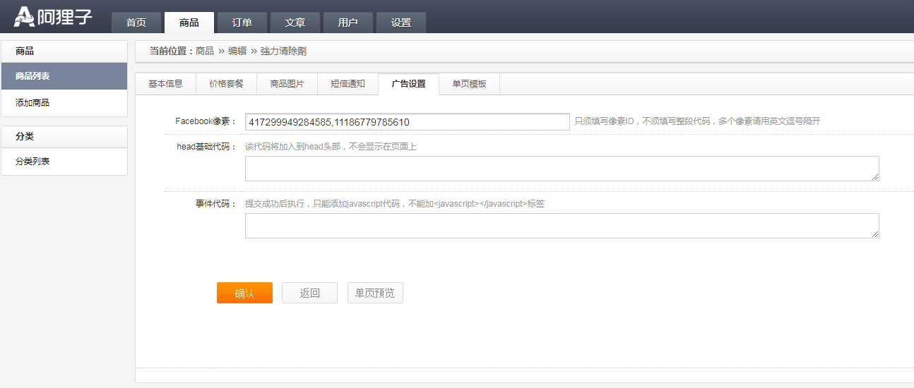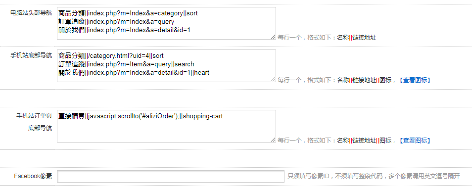 Facebook像素:只須填寫像素ID,不須填寫整段代碼,多個(gè)像素請用英文逗號(hào)隔開(例:417299949284585,11186779785610)